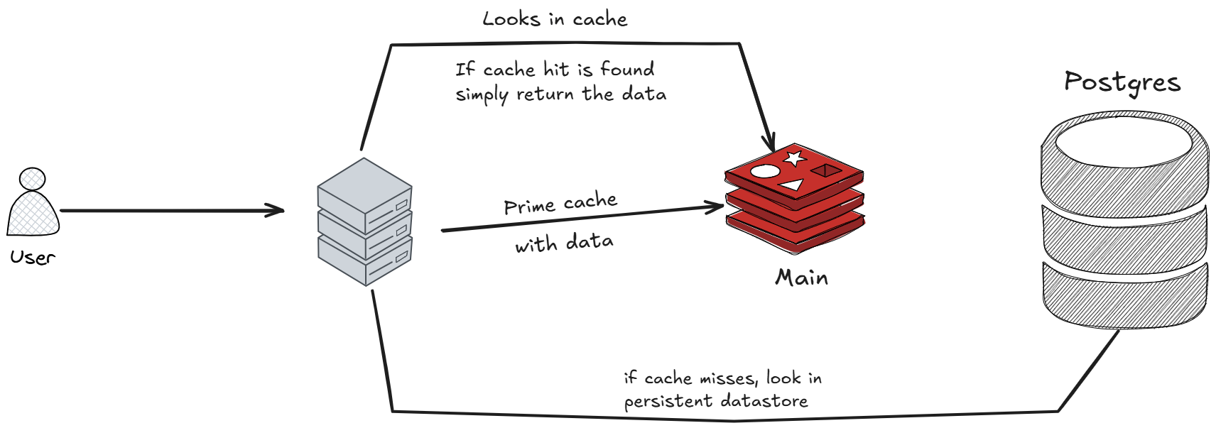 Lets say you have a web application where users frequently view their profiles fetching this data from a disk based database like MySQL everytime can be slow instead we can use redis to cache the user profile data so when a user requests their profile the application first checks redis, if the desired data is in redis it's a cache hit it is returned immediately, if the data is not in redis it's a cache miss the cache miss the application fetches it from the primary database stores it in redis and then returns it to the user. The data in redis can have TTL or Time To Live so it can automatically expire after a certain time for example say 15 to 20 minutes to ensure fresh is there all the time.