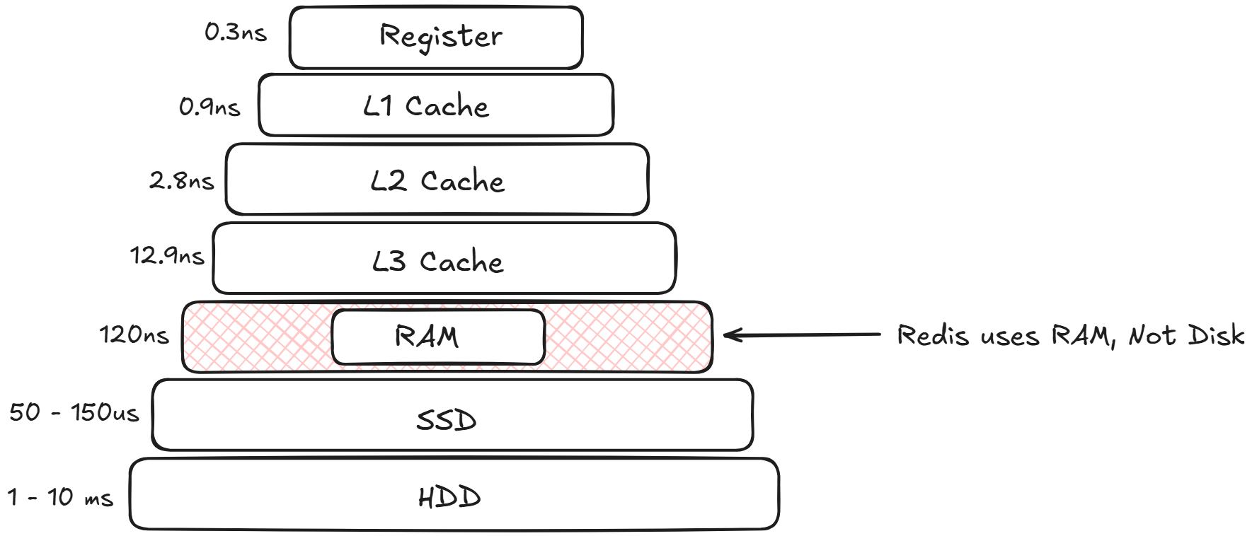 There are three main pillers behind this speed, first being the In Memory Data Storage, this is the most significant factor as accessing data from RAM is orders of magnitude faster than from even the fastest SSDs or NVMe drives. Main memory access latency is typically in the nanosecond range, while disk access is in the microsecond to millisecond range. By keeping the entire dataset in RAM, redis eliminates biggest bottleneck in database systems which is disk I/O