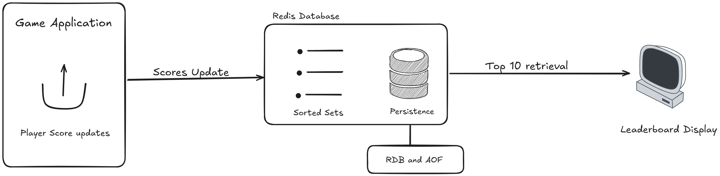 Here we need to maintain a realtime leaderboard where player scores are constantly updated and we need to display the top 10 players instantly. So here we can use redis as sorted set data structure to store player scores, each player score is added to the sorted set with their ID as the key and the score as the value this automatically sorts the scores so we can quickly retrieve the top 10 players using a single command like ZREVRANGE leaderboard 0 9. Redis can then process this data to disk using RDB or AOF to ensure durability.